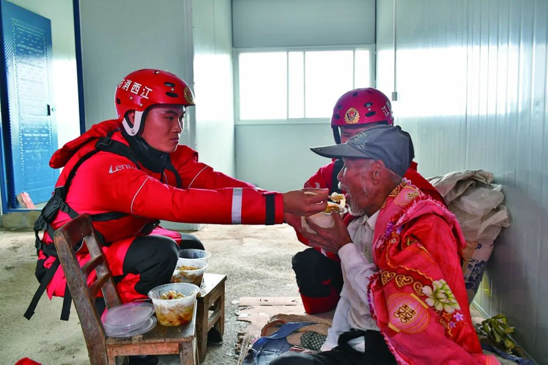 一名突擊隊(duì)員親切地握住老人瘦弱蒼老的手,和他耐心地交流起來。在老人囁嚅的聲音中,指戰(zhàn)員一遍又一遍地安慰著老人,告訴他“有我們在,不用怕”。隨后,抗洪突擊隊(duì)員又幫助老人打掃衛(wèi)生,整潔房間,并讓老人吃上了熱乎的飯菜。為了不讓老人嗆到,一名指戰(zhàn)員接過飯盒,一勺一勺地喂老人吃完,又為他留下了食用油、大米等日用品。
