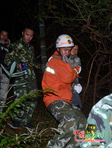 直到13日凌晨0時(shí)許,搜救人員在附近一高地隱約聽見小女孩的哭泣聲后,在銅線沖附近的山頂上發(fā)現(xiàn)了體力透支、正癱靠在樹上嗚咽的小女孩莊玉。官兵們輪流背著莊玉轉(zhuǎn)移下山。